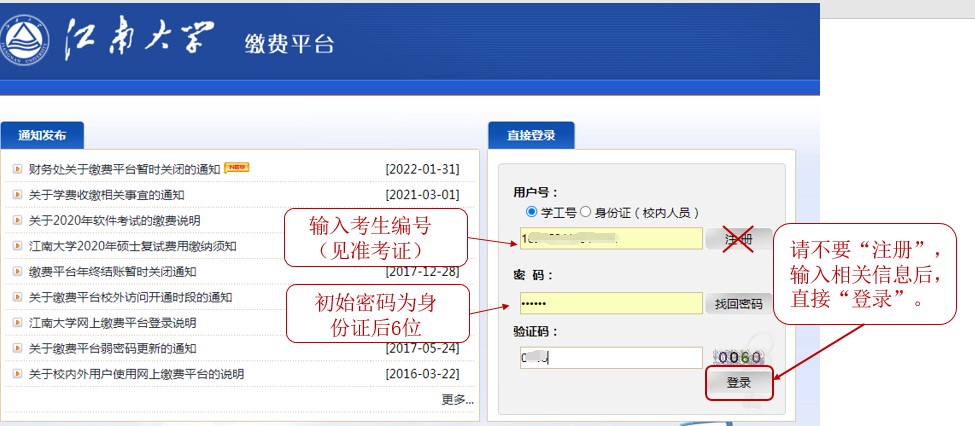 财务处”,在“业务办理”中选“学生缴费”。用户名及初始密码均为考生编号(15位,下载准考证后查看)和身份证后6位。 |