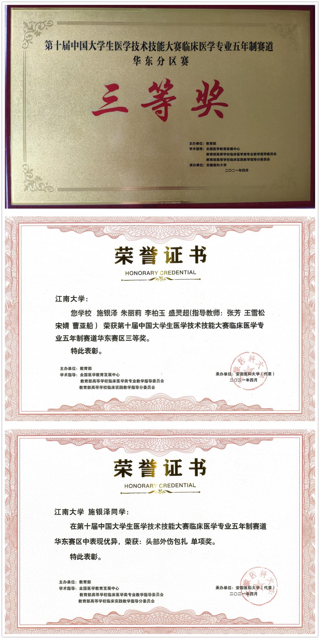 医学院临床2016级学生施银泽、朱丽莉、李柏玉和盛灵超代表学校参加比赛,其缜密的临床思维、娴熟的临床技能和扎实的知识储备受到了现场专家评委的一致好评,展现出了江南学子的风采和素养,并最终以团体第15名的优异成绩荣获三等奖。其中,施银泽同学在“头部外伤包扎”操作中反应灵敏迅捷,决策正确果断,操作规范熟练,表现极其突出,被授予该操作单项奖,也使得我校成为20个单项奖获奖单位之一。