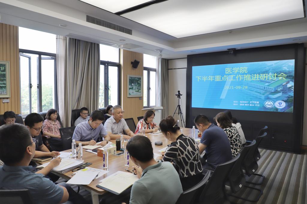 近期,为进一步贯彻落实学校召开的2021年下半年重点工作研讨会(扩大)会议要求,及时总结上半年工作情况,推动下半年重点工作的深入开展,医学院组织全体党政班子成员、院设管理干部和行政人员召开了为期三天的2021年下半年重点工作推进研讨会。医学院党委书记向琪、院长马鑫、党委副书记兼副院长奚晓岚,副院长陈雪、赵鹏、包羽,院长助理、系主任、科研平台主任以及学院办公室、党委人事管理干部等参加会议,校党委常委、副校长徐岩应邀出席会议。会议由向琪主持。