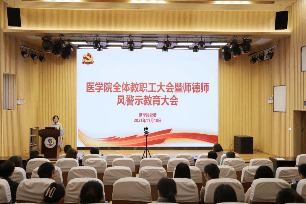 近日,医学院在学院C101报告厅召开全体教职工焦虑教育和师德师风警示教育大会,会议特邀财务处副处长、医学院财务专员李鹏,科学技术研究院重大项目与基金处周春霞做科研纪律和财经纪律宣讲。会议由党委书记向琪同志主持,学院全体教职工参加。