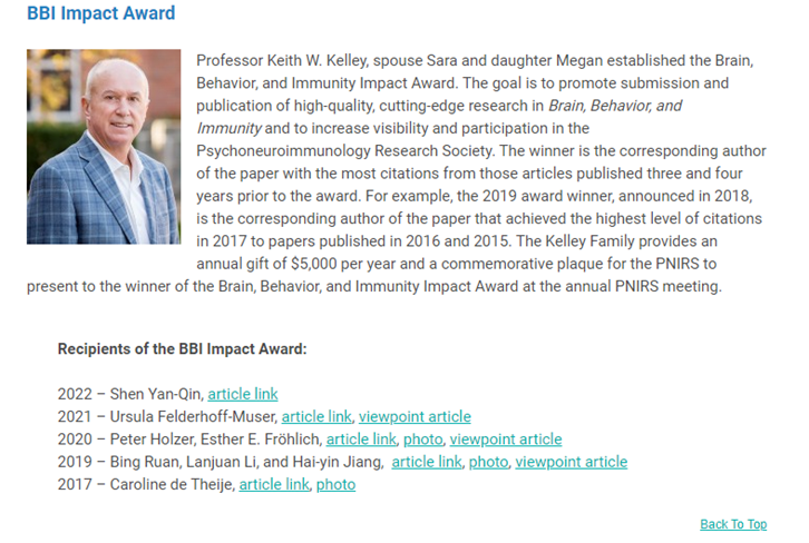 该奖项获得者通常为 Brain, Behavior & Immunity杂志当年获得引用率最高的高被引用论文的通讯作者,是98堂
