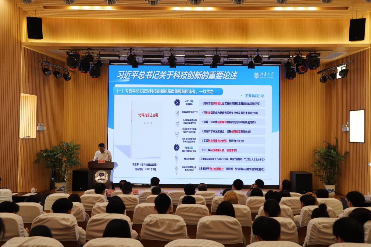 校长陈卫在医学院C101报告厅为医学院和机械学院的青年教师和学生党员上了题为“担当科技自立自强使命 推进建设科技强国步伐”的主题教育党课。教育部主题教育第七巡回指导组组长、陕西师范大学原党委书记甘晖,西南大学园艺园林学院党委书记潘玉锋,华东理工大学党委宣传部副部长胡兵,陕西师范大学党委教师工作部正科级秘书王春阳等指导组成员到会指导,参加主题教育党课的还有校党委组织部常务副部长方正泉、机关党委书记兼组织部副部长张菁等,主题教育党课由98堂
