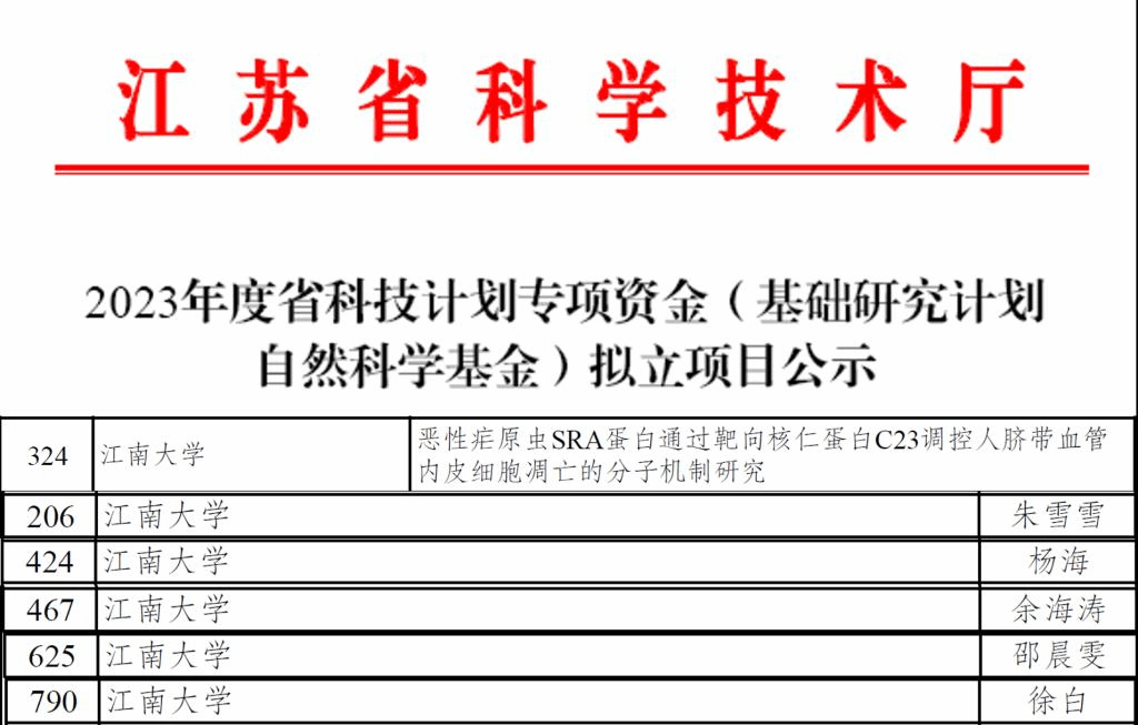 1项省面上和5项省青年拟获立项资助,其中程洋教授申请的省面上项目获得立项,题目为“恶性疟原虫SRA蛋白通过靶向核仁蛋白C23调控人脐带血管内皮细胞凋亡的分子机制研究”,余海涛、邵晨雯、朱雪雪、徐白和杨海老师申请的省青年项目获得立项,题目分别为“ATOX1缺陷通过铜死亡促进阿尔茨海默病认知损伤的具体作用机制研究”、“基于ABAD近红外荧光探针的癫痫脑内成像和小分子药物高通量筛选”、“脂肪因子nesfatin-1激活BMP-2信号通路在血管钙化中的作用及机制研究”、“脊髓背腹侧神经元前体细胞及运动神经元前体细胞移植促进脊髓损伤再生修复的研究”、 “金鸡纳啶通过抑制糖酵解途径改善治疗肥厚型心肌病的作用及其分子机制研究”。此次省自然科学基金申报项目获批立项是我院省自然科学基金申报工作的一个新的良好开端。