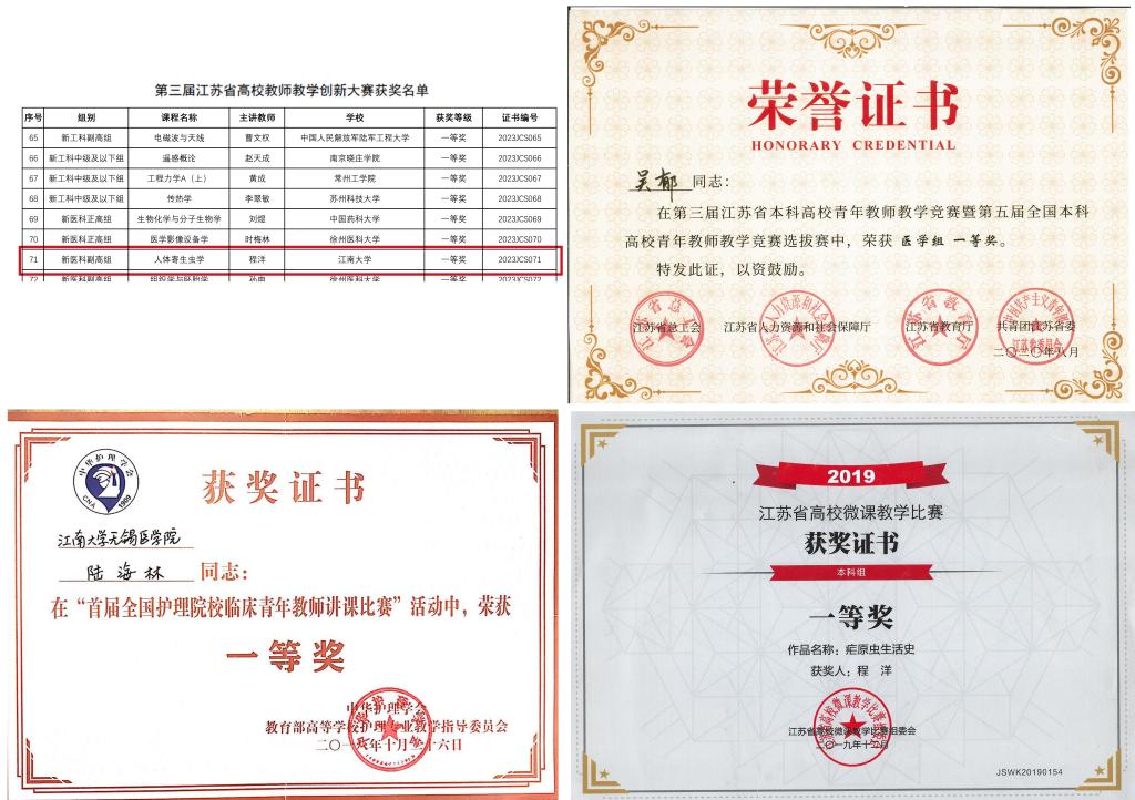 规范有效的师资培训推动了教学能力的提升。近年来,医学院教师在各类教学比赛中屡获佳绩,荣获全国护理院校临床青年教师讲课比赛一等奖1项、全国医学高等院校青年教师教学基本功比赛三等奖1项、江苏省高校教师教学创新大赛一等奖1项、江苏省高校青年教师教学竞赛一等奖2项、二等奖2项、江苏省高校微课教学比赛一等奖1项。