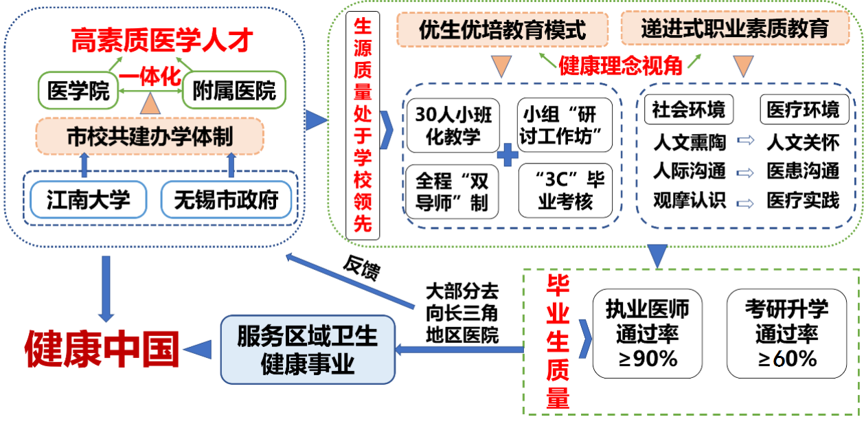 医学发展领导小组,建立市校、委院两级协调运行机制,为医学教育改革提供了优越的教学条件和有力的体制保障。无锡市政府提供专项资金超10亿元用于医学院建设,政策支持医科高水平人才引进、学科发展和教学改革。98堂