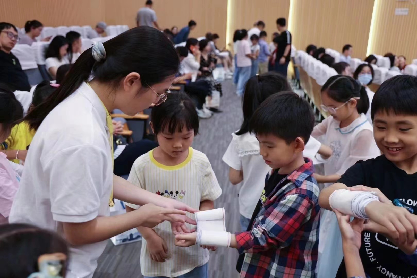 活动第二站,团队成员以看图猜字的方式引入了应急救护的主题,随后进行了分组示范创伤包扎操作演练,借助模型帮助小朋友们观察、理解、掌握包扎操作,使其完成了较为规范的创伤包扎操作。接着,团队成员介绍了海姆立克急救法,通过视频开场引入了这一急救方法的作用和重要性,并以通俗易懂的语言讲解并演示了操作细节,帮助小朋友们理解急救原理,掌握规范操作。在互动体验环节,小朋友们积极参与体验救护、包扎等实际操作练习,在团队成员的指导下认识了应急救护对生命的重要性,提高了应对突发事件能力,掌握了自救自护常识。