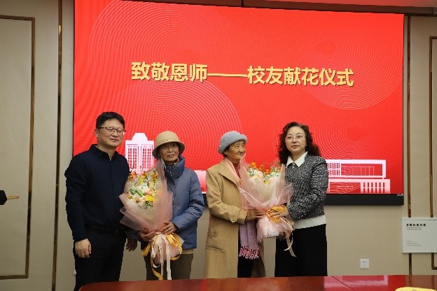校友们向恩师陈屏老师、缪爱棣老师献上鲜花,致敬老师们的教育之恩!