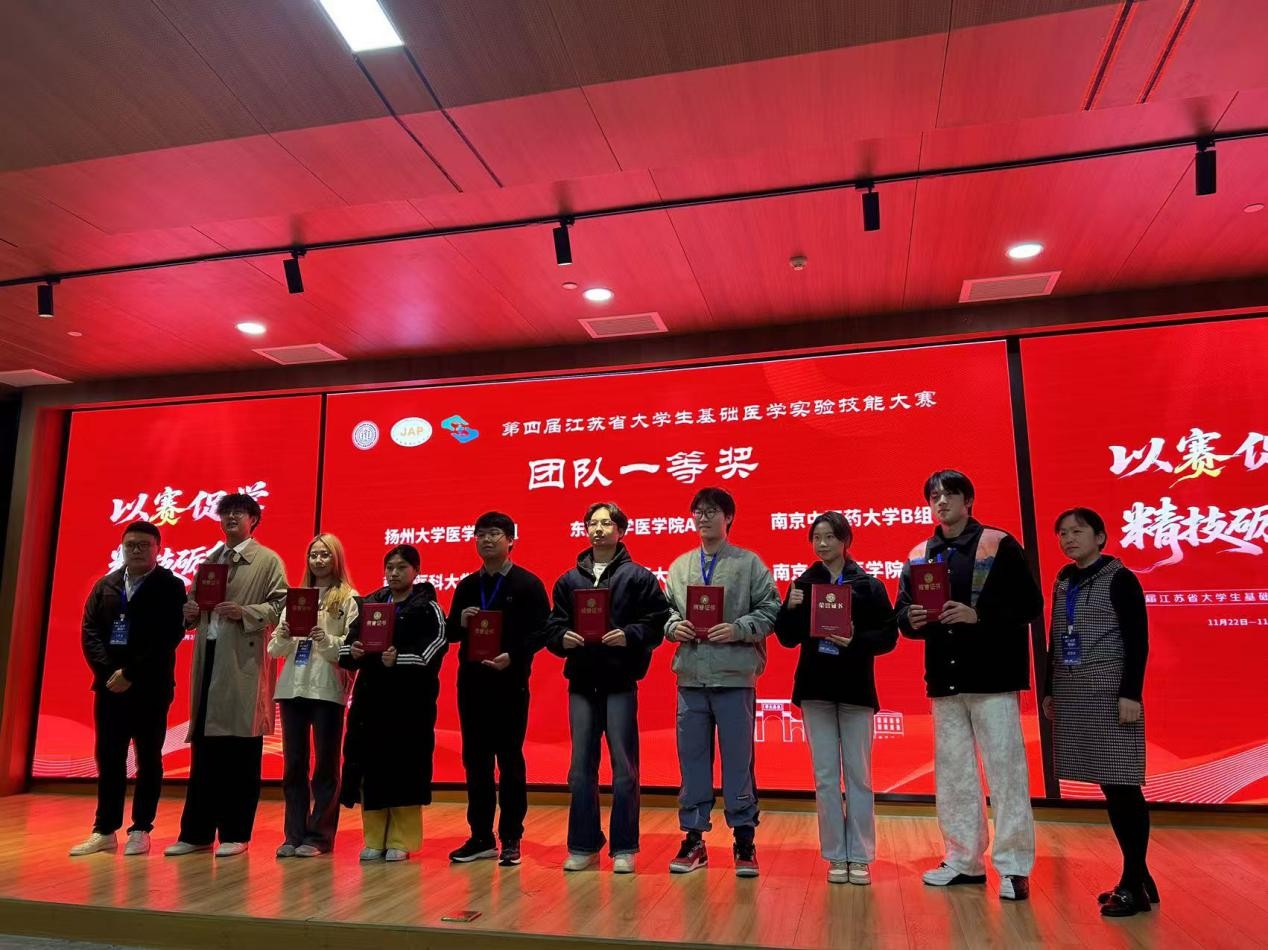 11月23日,第四届江苏省大学生基础医学实验技能大赛在苏州大学圆满落幕。经过激烈角逐,由我院实验教学中心选派的两支本科生代表队,在众多强劲对手中脱颖而出,最终斩获团队特等奖与团队一等奖各一项,创下参赛以来的最佳战绩。队员于天悦获评“优秀参赛选手”,指导老师蔡维维、陈俊良荣获“优秀指导教师”称号。
