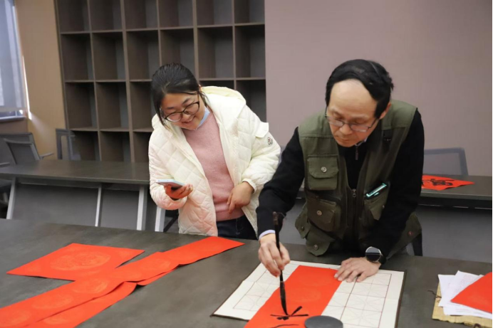 宣传部胡奕老师和有书法功底的同学担任“送福使者”,研磨挥毫,笔走龙蛇间,一幅幅寓意吉祥的春联、一个个饱满灵动的“福”字跃然纸上,老师们或驻足围观,或亲自提笔尝试,墨香氤氲中,大家互相切磋笔法、分享年味,一张张红纸承载着真挚的祝福,传递着同事间的深厚情谊。