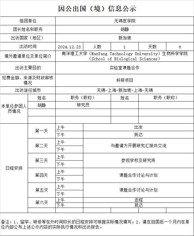 应新加坡南洋理工大学(NanYang Technology University)生物科学学院(School of Biological Sciences)的邀请,为科研合作交流,我单位拟派胡静率团一行1人于2024年12月23日赴新加坡参加科研合作交流。