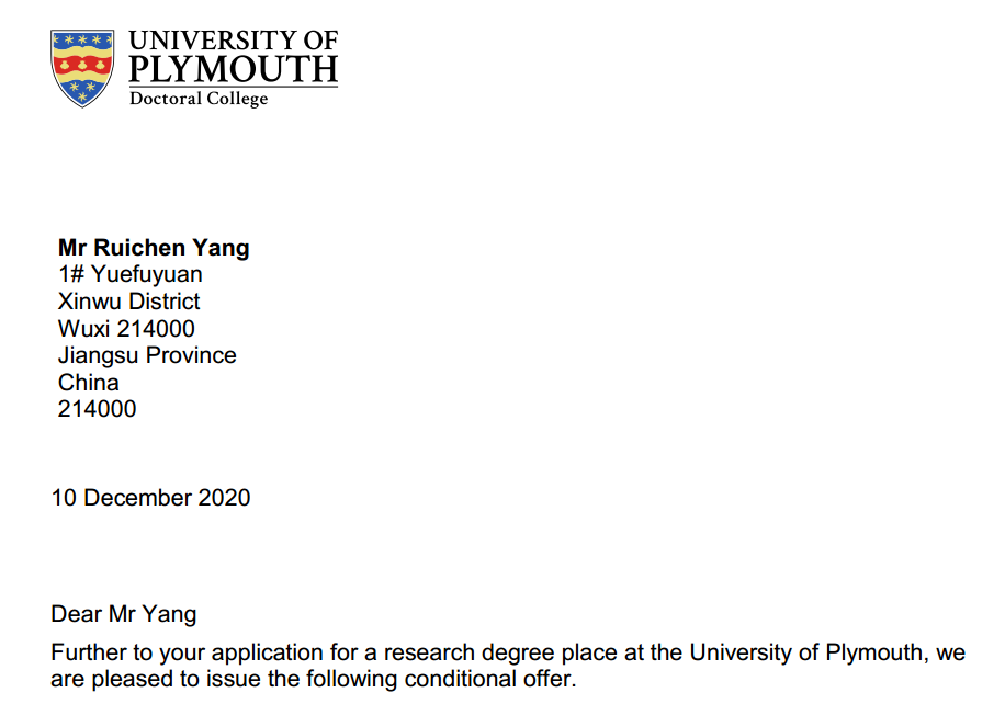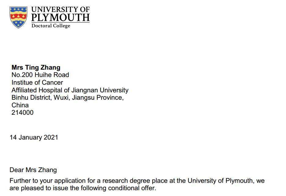 医学院与英国普利茅斯大学医疗与健康学院联合培养生物医学博士研究生项目进展顺利。经过前期报名申请、委员会审核、考试与面试等申请流程,最终我校附属医院心内科杨瑞晨和肿瘤研究所张婷两名职工成为该项目第一批培养对象,顺利被英国普利茅斯大学正式录取,即将攻读生物医学博士研究生。